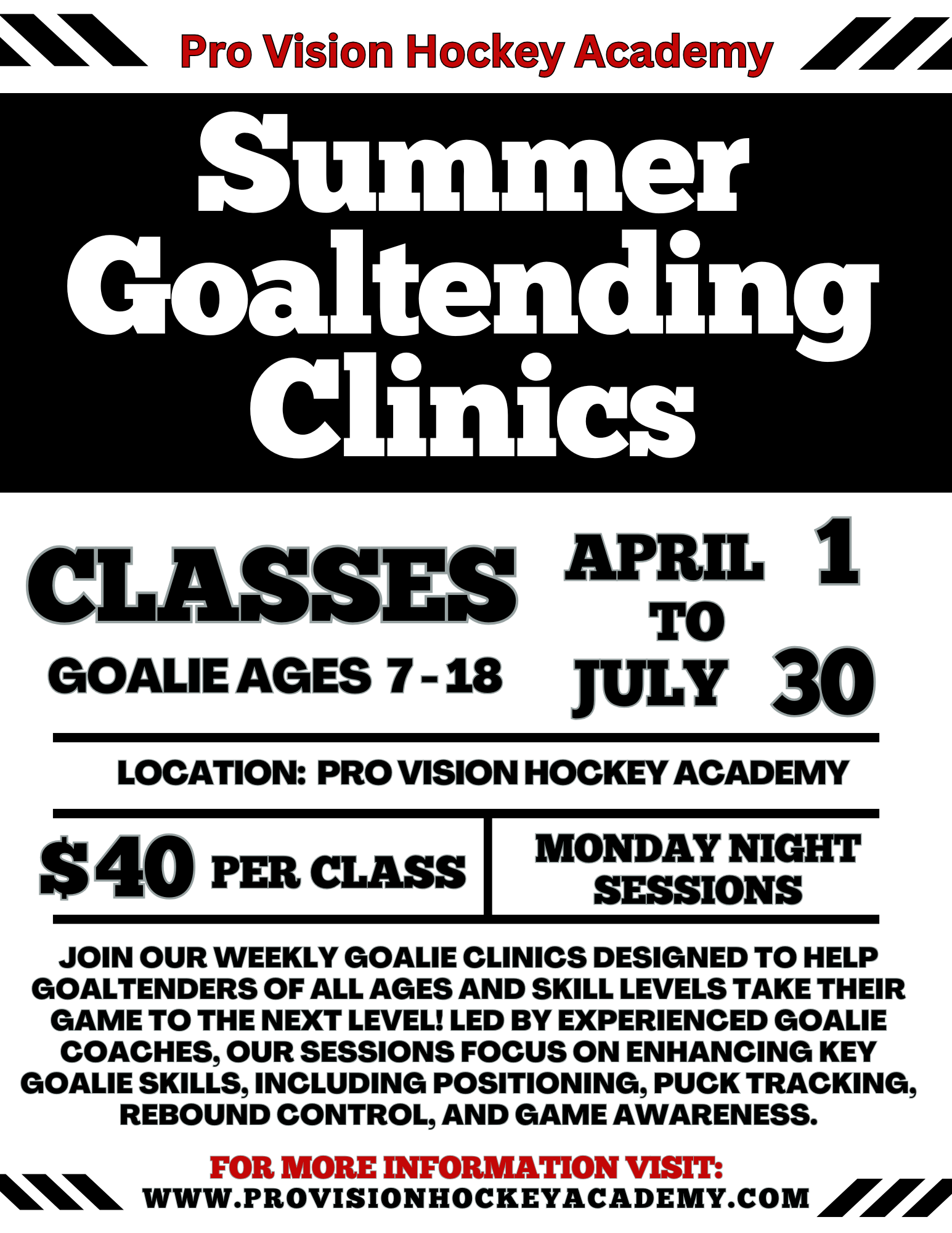 Join our Weekly Goalie Clinics designed to help goaltenders of all ages and skill levels take their game to the next level! Led by experienced goalie coaches, our sessions focus on enhancing key goalie skills, including positioning, puck tracking, rebound control, and game awareness.