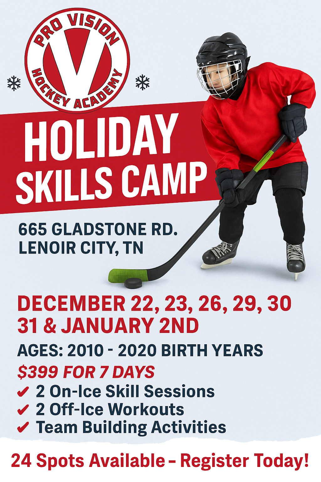 Take your hockey game to the next level with our Holiday Skills Day Camps! Perfect for Youth players of all ages and skill levels, our academy offers a comprehensive program designed to enhance every aspect of your performance on and off the ice.